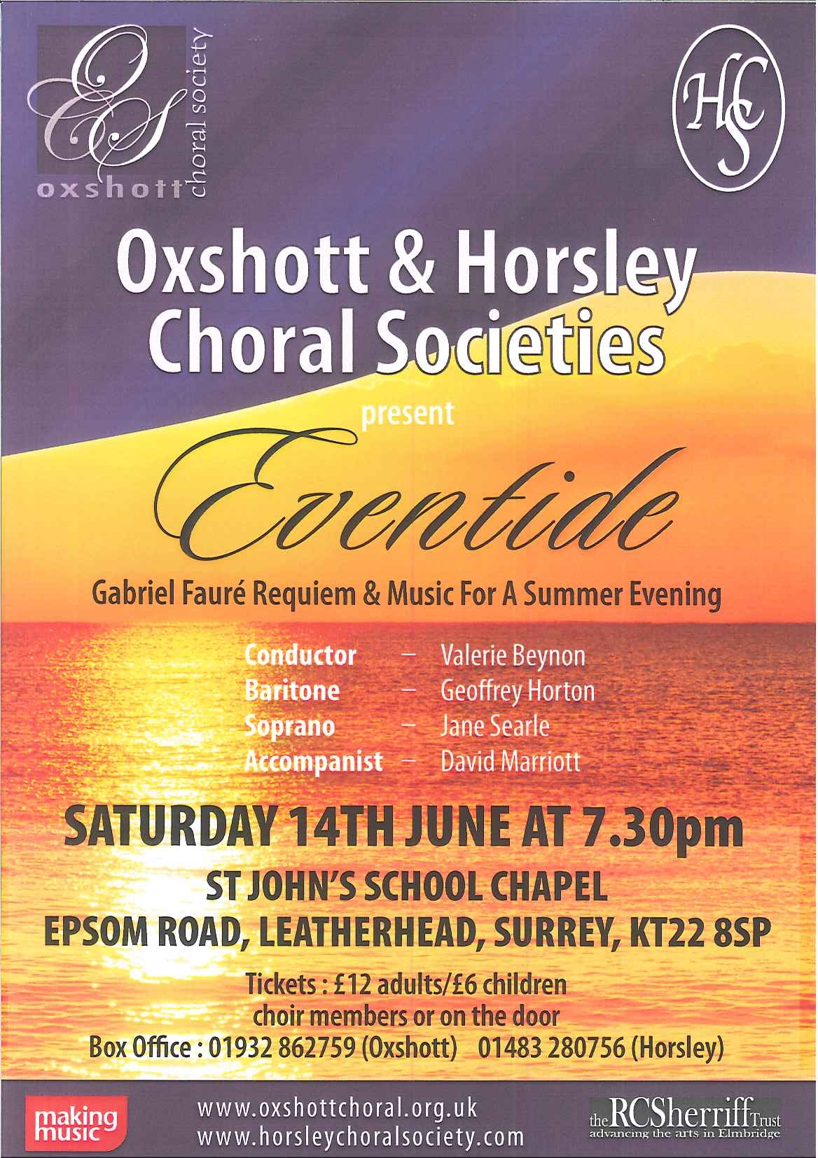 were blessed with a sunny evening at St John's, Leatherhead on 2 June for as OCS and HCS joined together with our wonderful soloists in a summer concert entitled Eventide. Two works by Faure, Cantique de Jean Racine and his much loved Requiem featured in the first half of the concert. After refreshments were enjoyed in the quad, a wide variety of musical items around the theme of summer and weather! were performed by choir and soloists.